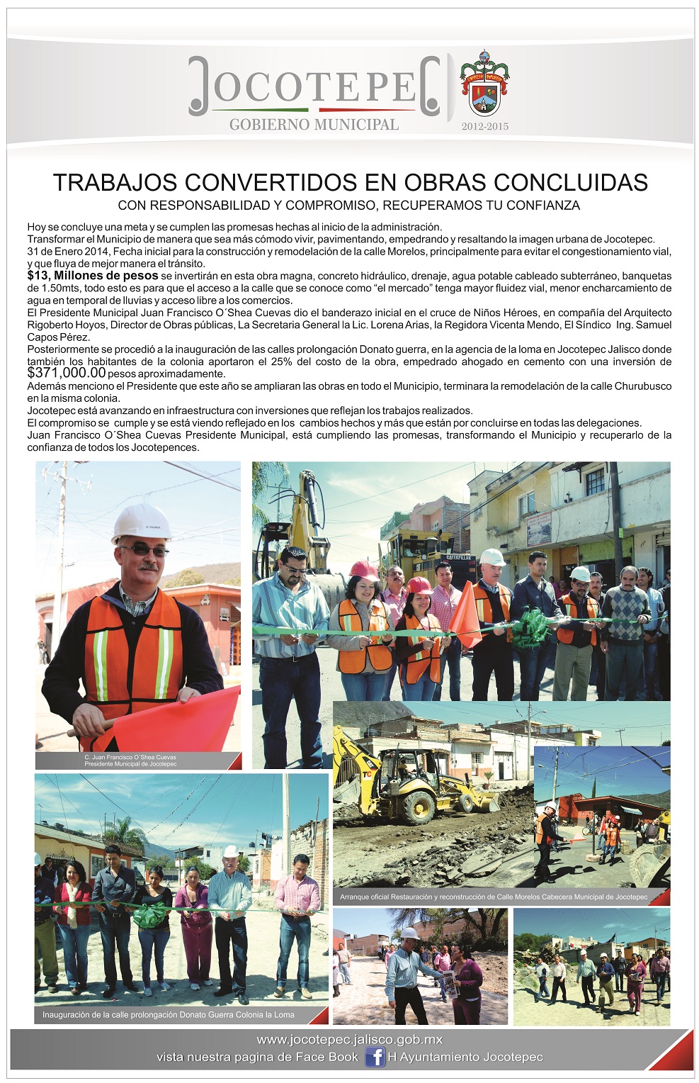 31 de Enero 2014, Fecha inicial para la construcción y remodelación de la calle Morelos, principalmente para evitar el congestionamiento vial, y que fluya de mejor manera el tránsito.