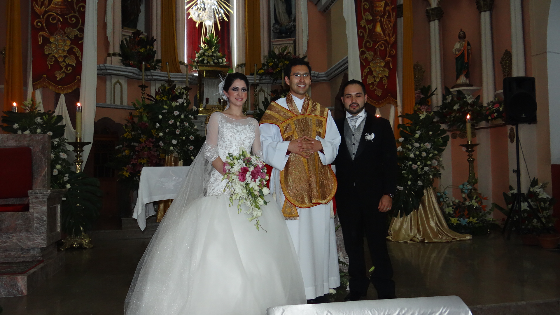 El templo estuvo muy adornado con muchas flores y jarrones desde la entrada principal hasta el altar,muchos de los presentes en la misa vinieron desde lejos a este matrimonio.