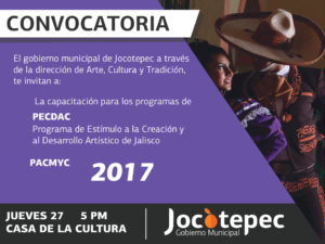 Gobierno de JocotepecTe invitamos a participar en la capacitación para los programas de PACMYC y PECDAC 2017, cualquier información en la dirección de#Culturade#Jocotepec.